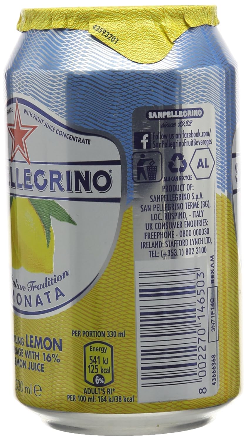 Calories in San Pellegrino Limonata (Can) and Nutrition Facts Nutrition summary: There are 120 calories in 1 can (330 ml) of San Pellegrino Limonata (Can). Calorie breakdown: 0% fat, 100% carbs, 0% protein. San Pellegrino Sparkling Fruit Beverage Limonata 330 Ml 6 Cans SAN PELLEGRINO SPARKLING FRUIT BEVERAGE LIMONATA 330 ML CANS (PACK OF 6) Nutrition Information Per 330 ml Amount % DV Calories 150 0 % Carbohydrate 35 g 12 % Fibre 0 g 0 % Sugars 33 g 0 % Fat 0 g 0 % Cholesterol 0 mg 0 % Saturated Fat 0 g 0 % Protein 0 g 0 % Sodium 0 mg 0 % Amount % DV Iron 0 % Vitamin A 0 % Vitamin C 0 % Sanpellegrino Lemon/Limonata Italian Sparkling Drinks - Target Includes twenty-four 11.15 fluid ounce cans of Sanpellegrino Limonata Italian Sparkling Drink These Sanpellegrino Italian sparkling drinks are made with carbonated water, real lemon juice (16% juice from concentrate), sugar and other natural flavors Great for any time of day, whether you want a bubbly sparkling beverage in the morning, or a refreshing sparkling drink at the end of the day This ...