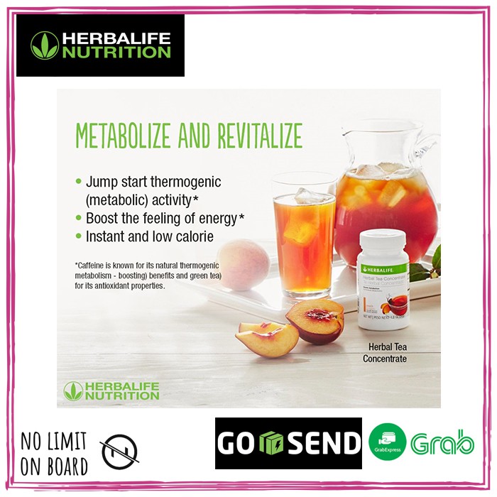 Herbal Tea Concentrate: Peach 3.6 Oz. | Herbalife Nutrition US Approximately 85 mg of caffeine per serving Jump-starts thermogenic (metabolic) activity* Boosts the feeling of energy* Provides antioxidant support Instant and low-calorie Usage Mix a little more than ½ teaspoon (1.7 g) of Herbal Tea Concentrate with 6 to 8 fl. oz. of hot or cold water. Enjoy two servings per day.
