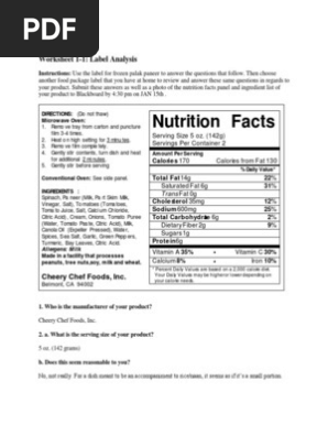 PDF READING FOOD LABELS - Peyton Manning Ch Agriculture (USDA) - require that all food labels show the same nutrition and health information. • Look at the food label as a whole, not only specific pieces of it, to get the full picture. Parts of a food label: a. Serving size i. Always start with the serving size amount, which is usually found at the top of the label. Lesson 1 Assignment Food Label Calorie Calculation Lesson 1 Writing Assignment: Food Label/Calorie Calculation. Short Answer 11 questions, 20 points. Directions: Use the food label image on page 3 to answer questions 1-11. Credit will not be given if work is not shown—even if your answer is correct! Food Label Assignment | PDF | Nutrition Facts Label | Foods Instructions: Use the label for frozen palak paneer to answer the questions that follow. Then choose another food package label that you have at home to review and answer these same questions in regards to your product. PDF Health 10 Food Label Assignment: Mr Brown Health 10 Food Label Assignment: Mr Brown 1. Read and Study these three packages labels. Each is linked to larger images for easy viewing. 2. Print out question sheet from the link below. 3. Answer questions on sheet and hand into Mr. Brown on the due date for your class.