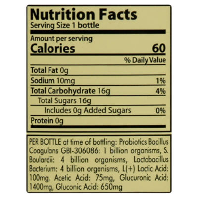 Calories in GT's Organic Raw Kombucha and Nutrition Facts There are 30 calories in 1/2 bottle (8 oz) of GT's Organic Raw Kombucha. Calorie breakdown: 0% fat, 100% carbs, 0% protein. Related Nutrition Drinks from GT's: CocoKefir Pure: Organic Raw Kombucha Multi-Green: Organic Raw Gingerade Kombucha: Organic Raw Kombucha (Bottle) Original - GT's Living Foods GT's Kombucha*, (kombucha culture*, black tea*, green tea*, cane sugar*), and 100% pure love!!! ... GT's original recipe—unchanged since 1995. Close. Check whether we deliver in your area! Please enter your area zip code below to check whether we currently deliver to your area.