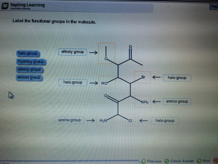 Solved Label the functional groups in the molecule. You are - Chegg Question: Label the functional groups in the molecule. You are currently in a labeling module. Turn off browse mode or quick nav, Tab to items, Space or Enter to pick up, Tab to move, Space or Enter to drop. This problem has been solved! See the answer See the answer See the answer done loading.