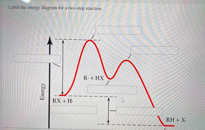 Solved Label the energy diagram for a two-step reaction. - Chegg Expert Answer. 100% (54 ratings) Transcribed image text: Label the energy diagram for a two-step reaction. enthalpy change transition state starting materials RX+H products rate-limiting transition state intermediates activation energy reaction coordinate.