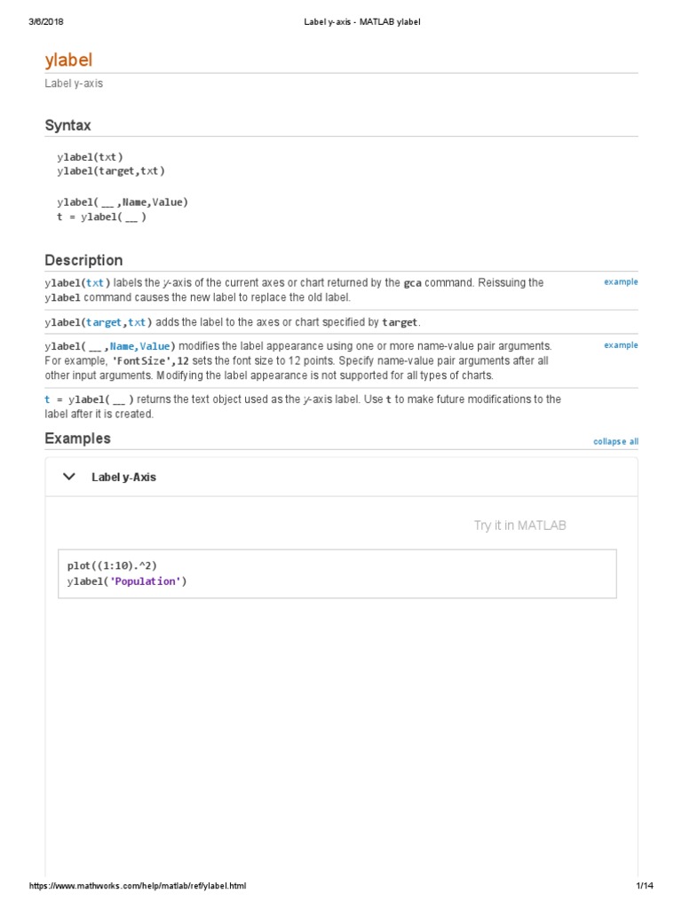 Axes in MATLAB - Plotly Make Axes the Current Axes. Create two overlayed Axes objects. Then, specify the current axes and add a plot. First create two Axes objects and specify the positions. Display the box outline around each axes. Return the Axes objects as ax1 and ax2. Make ax1 the current axes. de.mathworks.com › help › matlab2-D line plot - MATLAB plot - MathWorks Deutschland Plot the row times on the x-axis and the RainInchesPerMinute variable on the y-axis. When you plot data from a timetable, the row times are plotted on the x-axis by default. Thus, you do not need to specify the Time variable. Return the Line object as p. Notice that the axis labels match the variable names. Specify Axis Tick Values and Labels - MATLAB & Simulink - MathWorks By default, the y -axis tick labels use exponential notation with an exponent value of 4 and a base of 10. Change the exponent value to 2. Set the Exponent property of the ruler object associated with the y -axis. Access the ruler object through the YAxis property of the Axes object. The exponent label and the tick labels change accordingly. Label y-axis - MATLAB ylabel - MathWorks France ylabel (txt) labels the y -axis of the current axes or standalone visualization. Reissuing the ylabel command causes the new label to replace the old label. ylabel (target,txt) adds the label to the specified target object. example. ylabel ( ___,Name,Value) modifies the label appearance using one or more name-value pair arguments.