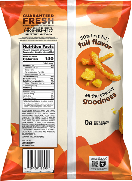 CHEETOS ® Baked Crunchy Cheese Flavored Snacks CHEETOS ® Baked Crunchy Cheese Flavored Snacks are dangerously cheesy and 50% less fat than regular cheese flavored snacks. You can let your inner cheetah run. Nutrition Facts Ingredients Buy Now Buy Now CHEETOS® Baked Crunchy Cheese Flavored Snacks (opens a popup) Product Reviews ★★★★★ ★★★★★ 5.0 3 Reviews