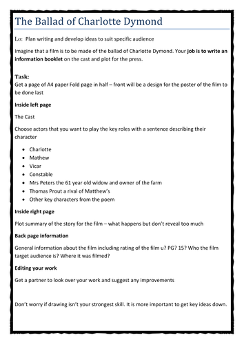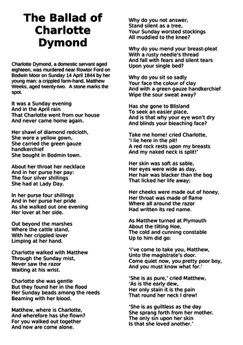 The ballad of charlotte dymond analysis. › art › balladBallad | narrative song | Britannica ballad, short narrative folk song, whose distinctive style crystallized in Europe in the late Middle Ages and persists to the present day in communities where literacy, urban contacts, and mass media have little affected the habit of folk singing. The term ballad is also applied to any narrative composition suitable for singing. | Ballad Health Ballad Health was created to improve the health and well-being of those we serve, and we plan to honor your trust by providing you and your family the highest quality care possible. We know you want a healthcare provider who truly listens to you and understands what you need. Investing in Appalachia literarydevices.net › balladBallad - Examples and Definition of Ballad as Literary Device Ballad is a general literary term that does not require a fixed poetic form. Many ballad poems are variations of the form or departures from it. As a form of narrative verse, ballads can be poetic or musical, but not all of them are songs. In addition, though most ballads tell a story, this is not a requirement of balladry. poets.org › glossary › balladBallad | Academy of American Poets Ballad | Academy of American Poets Ballad A typical ballad is a plot-driven song, with one or more characters hurriedly unfurling events leading to a dramatic conclusion. Often, a ballad does not tell the reader what’s happening, but rather shows the reader what’s happening, describing each crucial moment in the trail of events.