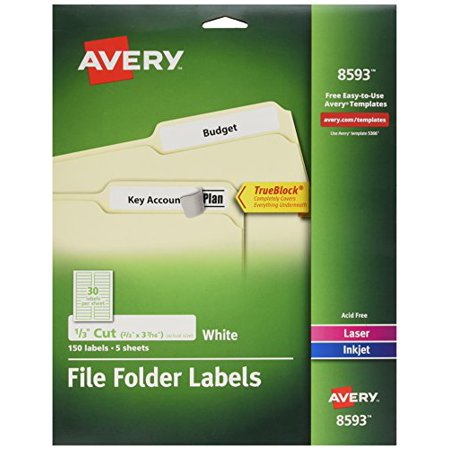 Amazon.com: Avery 8593 Labels Avery File Folder Labels, 6667 x 3.4375", White, Pack of 150 (08593) 4.8 (4,037) $1237 ($0.08/Count) FREE delivery Mar 20 - 23 Or fastest delivery Mar 17 - 21 Amazon's Choice Avery File Folder Labels for Laser and Inkjet Printers with TrueBlock Technology, 2/3 x 3-7/16 Inches, White, 4 Packs (8593) 4.7 (101) $3395 Save more with Subscribe & Save Unable to print any Avery Labels correctly - HP Support ... Jul 21, 2020 · In particular, a printer might require a larger bottom margin. In the case of the Avery 8593 template, the bottom margin setting is showing a bit under the .5 inch mark. I don't have any idea of your printer's margin tolerances. It is not uncommon for a printer to require a larger bottom margin.