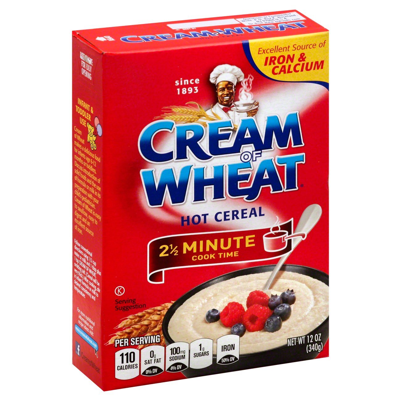 Original 2½ Minute - Cream of Wheat® Ingredients Wheat Farina, Calcium Carbonate, Defatted Wheat Germ, Disodium Phosphate, Ferric Orthophosphate (Iron), Niacinamide (Vitamin B3), Thiamine Mononitrate (Vitamin B1), Pyridoxine Hydrochloride (Vitamin B6), Riboflavin (Vitamin B2), Folic Acid, Cholecalciferol (Vitamin D3). Allergy Information Contains Wheat Kosher Cinnabon® - Cream of Wheat® WHEAT FARINA, SUGAR, NATURAL FLAVORS, CINNAMON, CALCIUM CARBONATE, SALT, GUAR GUM, DEFATTED WHEAT GERM, DRY MOLASSES, XANTHAN GUM, FERRIC ORTHOPHOSPHATE (IRON), CARAMEL COLOR, VITAMIN A ACETATE, NIACIN (VITAMIN B3), CHOLECALCIFEROL (VITAMIN D), RIBOFLAVIN (VITAMIN B2), PYRIDOXINE HYDROCHLORIDE (VITAMIN B6), THIAMINE MONONITRATE (VITAMIN B1), … Calories in 1 packet of Instant Cream Of Wheat and Nutrition Facts There are 80 calories in 1 packet of Instant Cream Of Wheat. Get full nutrition facts and other common serving sizes of Instant Cream Of Wheat including 100 g and 1 cup. Register ... There are 80 calories in 1 packet of Instant Cream Of Wheat. Calorie breakdown: 3% fat, 85% carbs, 12% protein. Other Common Serving Sizes: Serving Size Calories ... Original Cream of Wheat - Single-Serve Packets Ingredients Wheat Farina, Calcium Carbonate, Salt, Defatted Wheat Germ, Guar Gum, Natural Flavor, Ferric Orthophosphate (Iron), Niacinamide (Vitamin B3), Thiamin Mononitrate (Vitamin B1), Pyridoxine Hydrochloride (Vitamin B6), BHT (to preserve freshness), Riboflavin (Vitamin B2), Folic Acid, Cholecalciferol (Vitamin D3). Kosher
