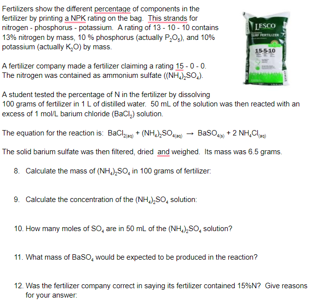 Fertilizers show the different percentage of components in the fertilizer by printing NPK rating on the bag: This strands for nitrogen phosphorus potassium: A rating of 13 - 10 10 contains 13% ...